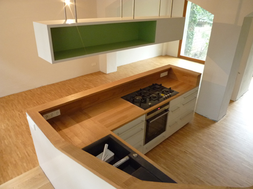Blick von oben in den Koch - Ess - Wohnblock > Treppendetails >> 1. Obergeschoss / Geländermöbel >>> Küchenblock / Treppe