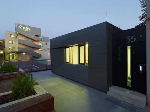 Seitenansicht, Blick auf das rückwärtige Fabrikgebäude, bei Nacht