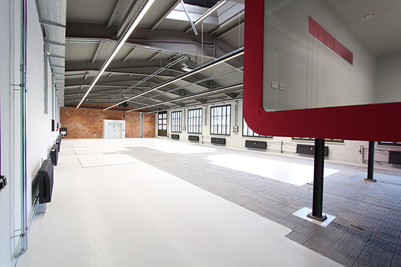 < Werkhalle mit Besprechungsraum im ehemaligen Filmvorführraum